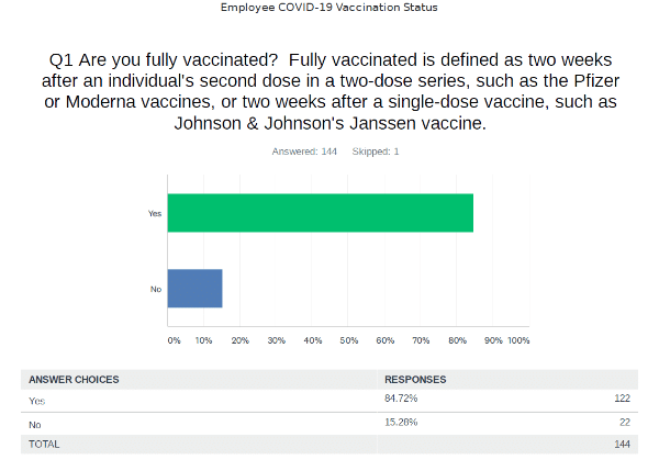 | As a result of a recommendation from the Stephenson County Health Department, an anonymous survey was administered to Highland employees in June/July to determine our percentage of COVID-19 vaccinated employees. Below are the results. Out of 144 respondents, 122 (85%) were fully vaccinated and 22 (15%) were not. Of those who were not vaccinated, one person planned to be fully vaccinated prior to the start of the fall semester. Of those indicating that they were not fully vaccinated, all planned to be working on campus this fall. |